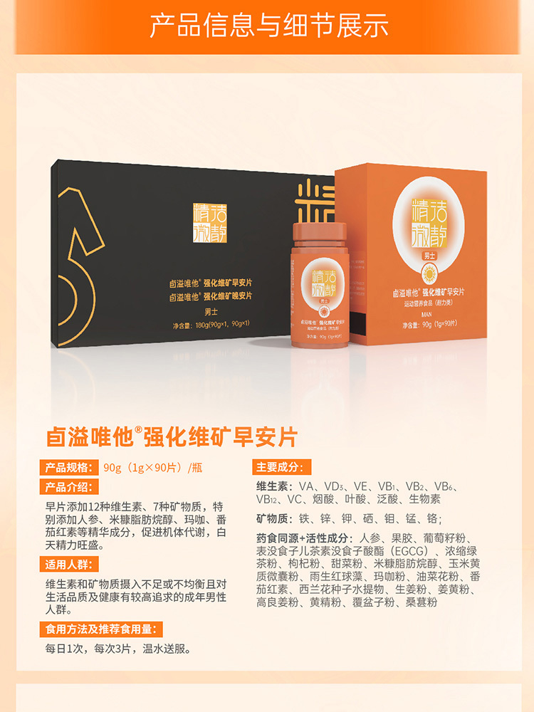 多种维生素矿物质,具有肝细胞再生、肝功能增强、肝脏解毒能力提高、脂肪代谢改善、免疫调节等作用。我们采用精准营养设计,根据男女身体节律不同,分为男女款,早晚片。早三片提精神,晚三片助睡眠。